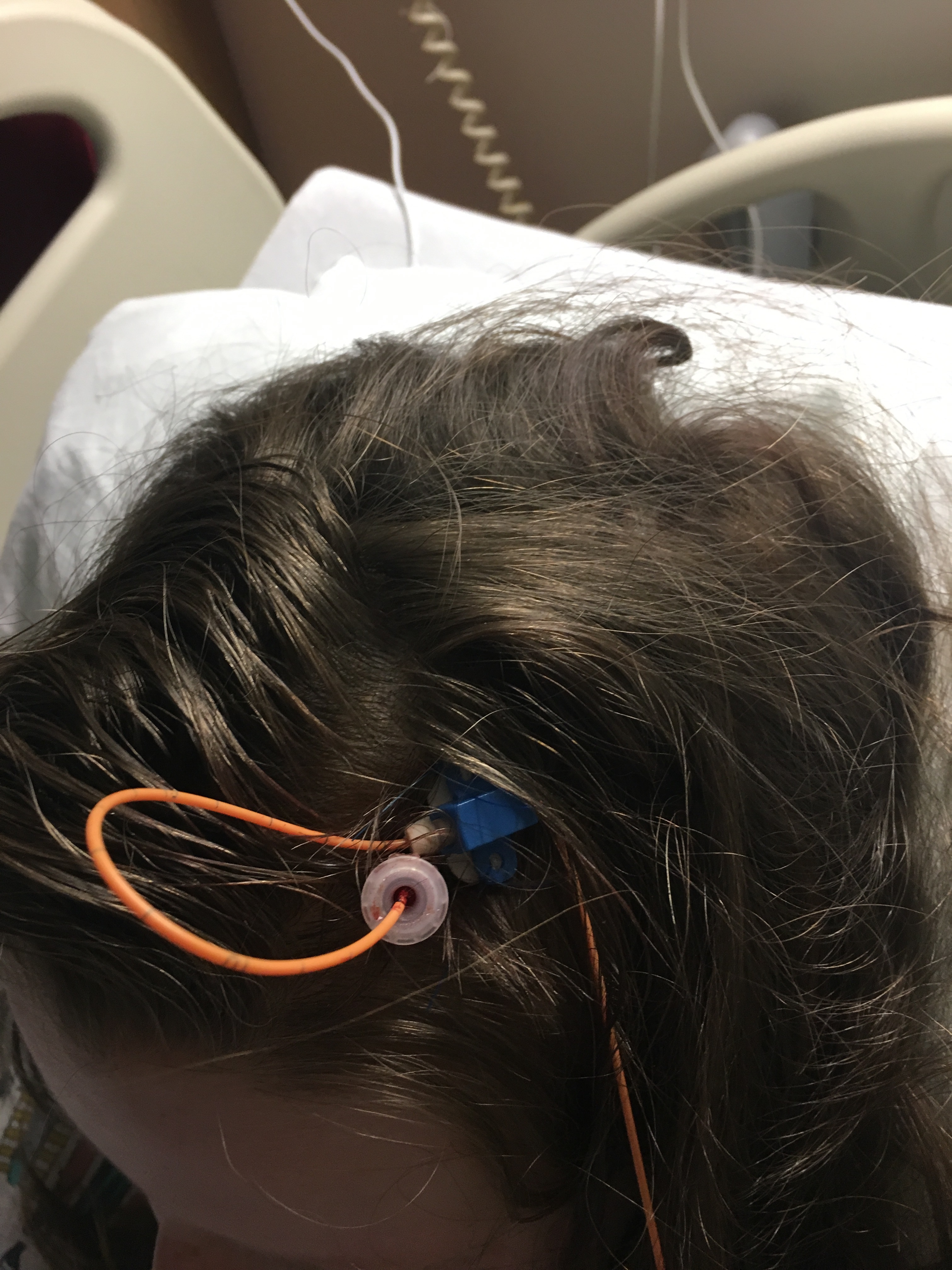 Next day it was decided that I could go home for the weekend but I had to come back in on Monday afternoon to get ready for pressure monitoring. On Tuesday morning I had to have a small operation to get a special bolt fitted into my head that would attach to the pressure monitor. I was out for about an hour and the wound was sore but not too bad. The pressure monitor was on for 48 hours and during that time I was wired up to a computer that took the readings. Any time I changed position or went to the toilet it had to be recorded on the computer. It’s a bit of a pain because I have to stay in bed while this is going on.